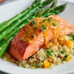 This Apricot Dijon Glazed Salmon recipe features tender salmon fillets coated with a flavorful glaze made from apricot preserves, grainy and Dijon mustards, soy sauce, lime juice, ginger, and garlic. Baked to perfection, the glaze caramelizes slightly, complementing the rich, flaky salmon with a tangy, sweet, and savory finish. Perfect for a quick, healthy weeknight dinner, this dish pairs well with steamed vegetables or rice.