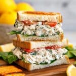A sandwich cut in half and stacked on top of each other showing three main layers: at the top and bottom, toasted golden-brown bread with a slightly crispy texture; the thick middle layer is creamy white chicken salad mixed with green leafy spinach, topped with fresh red tomato slices. There is a piece of green leaf lettuce peeking out at the bottom left side. The sandwich is placed on a wooden board with a few broken orange crackers near it, and a sliced lemon wedge at the bottom right. The background is a white marbled texture with a blurred bowl of bright yellow lemons in the upper left. Photo taken with an iphone --ar 4:5 --v 7