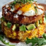 - Assemble the Sandwiches: On a serving plate, place one corn fritter as the base layer. Top this with a fried egg, then add a slice of bacon or a cooked sausage patty if desired. Add sliced avocado and a handful of fresh arugula on top. If you like extra heat, drizzle some hot sauce over the fillings, then cover the sandwich with another corn fritter to complete the stack.