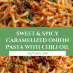 Keywords: caramelized onion pasta, chili oil pasta, spicy pasta recipe, vegetarian Italian pasta, easy weeknight dinner, sweet and spicy pasta