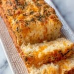 Cheddar Bay Biscuit Bread is a savory, cheesy bread inspired by the flavors of famous cheddar bay biscuits. This moist and fluffy bread combines shredded cheddar cheese, a hint of garlic and onion in the topping, and a buttery, tender crumb that makes it the perfect side for any meal or a delicious snack on its own.