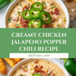 Keywords: Chicken chili, Jalapeño popper chili, Creamy chicken chili, Bacon chili, Spicy chicken soup, Comfort food chili
