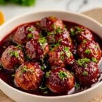 These Cranberry Meatballs feature tender, pre-cooked meatballs simmered in a tangy, sweet, and slightly spicy homemade cranberry chili sauce. Perfect as an appetizer or party snack, this easy-to-make dish combines the festive flavor of cranberry sauce with the hearty taste of beef or turkey meatballs, creating a crowd-pleasing treat that’s quick to prepare and full of zest.