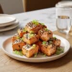 - Add garnish and serve: Transfer the coated salmon bites to a serving plate. Sprinkle with chopped green onions, sesame seeds, and optional red pepper flakes for added heat and visual appeal. Serve immediately.