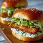 This Crispy Chicken Caesar Sandwich combines juicy, buttermilk-marinated chicken breasts fried to golden perfection with a rich, homemade Caesar dressing, crisp romaine lettuce, and shaved Parmesan cheese, all nestled inside soft brioche buns. The sandwich offers a satisfying blend of crunchy, creamy, and tangy flavors, perfect for a hearty lunch or casual dinner.