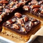 - Cool and Serve: Allow the bars to cool completely before lifting them out of the pan using the parchment paper overhang. Optionally, garnish with extra chopped pecans, sea salt flakes, or a drizzle of caramel sauce before cutting into bars and serving.