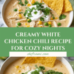Keywords: white chicken chili, chicken chili recipe, easy chili recipe, creamy chili, stovetop chili, comforting dinner