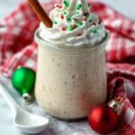 The image shows a creamy, light beige drink served in a clear glass jar with a white rim. The top layer has a thick swirl of white whipped cream, decorated with small red and green round sprinkles. A cinnamon stick is placed upright in the whipped cream on the right side. The jar sits on a red and white checkered cloth over a white marbled surface, with a white spoon beside it. There are blurred Christmas ornaments in green and red colors near the jar, adding a festive touch. Photo taken with an iphone --ar 4:5 --v 7