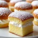 A close-up view of a small cream-filled cake arranged on a white plate. Each cake has three layers: a light golden brown top layer dusted with white powdered sugar, a soft yellow sponge cake middle layer, and a thick white whipped cream filling sandwiched between two parts of the sponge cake. The texture of the sponge is fluffy and moist, while the cream looks smooth and airy. Multiple cakes are in the background, out of focus, showing the same layered look. The surface underneath the plate is a white marbled texture. photo taken with an iphone --ar 4:5 --v 7