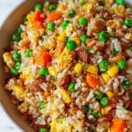 Freakin’ Fantastic Fried Rice is a quick and easy stovetop dish featuring cold cooked rice stir-fried with buttery onions, peas, carrots, and scrambled eggs, enhanced with savory soy sauce. Perfect as a standalone meal or a side, this recipe offers a comforting combination of flavors and textures that can be customized with your choice of proteins or spices.