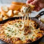 This Gooey Garlic Bread Dip is a rich and creamy appetizer featuring roasted garlic blended with cream cheese, sour cream, mozzarella, and Parmesan cheeses. Baked to bubbling perfection and topped with fresh parsley, it’s perfect for dipping with crostini or crackers and is sure to be a crowd-pleaser at any gathering.