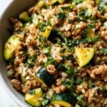 A wholesome and flavorful Ground Chicken Zucchini Rice Skillet combining tender ground chicken, fresh zucchini, and fluffy rice cooked together in a single pan with aromatic spices. Perfect for a comforting and easy-to-make main course.