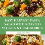 Keywords: Harvest Pasta Salad, roasted vegetables pasta salad, butternut squash pasta salad, Brussels sprouts salad, fall salad recipe, vegetarian pasta salad