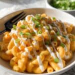 - Serve: Plate the buffalo chicken mac and cheese and top with optional ranch dressing, chopped green onion, and freshly cracked black pepper if desired. Enjoy immediately while warm.