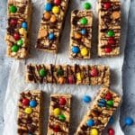 - Add M&M’s: After a few minutes, gently press the mini M&M’S onto the surface of the bars, being careful not to crush them to prevent melting.