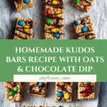 Homemade Kudos Bars are a delightful mix of crisped rice, oats, and sweet syrup, topped with colorful mini M&M’s and a luscious chocolate coating. These bars offer a perfect balance of chewy and crunchy textures with a rich chocolate finish, making them an irresistible treat for any occasion.