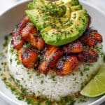 6. Assemble the Stack: Using a ring mold or a cookie cutter, layer the components starting with the fluffy rice at the bottom, followed by the glazed chicken, and topped with sliced avocado. Drizzle with a little extra lime juice for brightness before serving.