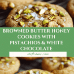 Keywords: honey cookies, browned butter cookies, pistachio cookies, white chocolate cookies, baked cookies, sweet snacks, homemade cookies