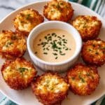 These irresistibly crispy crab cake bites are a flavorful appetizer featuring lump crab meat blended with cream cheese, sour cream, and Old Bay seasoning, baked to golden perfection in a crispy panko-Parmesan crust. Served with a zesty lemon-dill dipping sauce, these bite-sized delights are perfect for parties or gatherings.