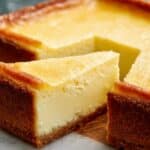 A close-up image of a square cheesecake with a thick golden-brown crust on the bottom and edges. The cheesecake filling is smooth and creamy, pale yellow in color, with a slightly glossy surface. One slice is cut and slightly pulled out, showing the thick filling and crust layers clearly. The dessert sits directly on a white marbled textured surface. Photo taken with an iphone --ar 4:5 --v 7