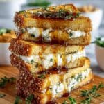 A deliciously melty and crispy Jam Sandwich Melt featuring tangy goat cheese, sharp cheddar, and sweet fig jam on buttery sourdough bread, grilled to golden perfection with a hint of fresh thyme and black pepper.