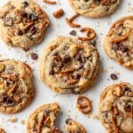 The image shows several soft, round cookies with a golden-brown base color and a slightly cracked surface, each topped with scattered small chocolate chips and broken pretzel pieces. The cookies are placed on a white marbled surface with some crumbs and loose chocolate chips and pretzel pieces around them, adding a casual and inviting feel. A few cookies are whole, while others are broken into smaller pieces, revealing a chewy texture inside. The overall scene is bright and warm, focusing on the crunchy and chocolatey elements of the cookies. photo taken with an iphone --ar 4:5 --v 7