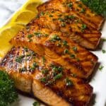- Serve and Garnish: Remove the salmon from the oven and let it rest for a few minutes to allow the juices to redistribute. Garnish with freshly chopped parsley and serve with lemon wedges for a bright, refreshing accompaniment.