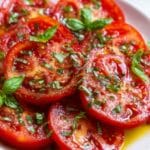 This Marinated Tomatoes recipe features ripe, juicy tomatoes soaked in a flavorful blend of extra virgin olive oil, balsamic vinegar, fresh herbs, garlic, and spices. Ideal as a refreshing side dish, salad topping, or accompaniment to grilled meats and bruschetta, this simple yet vibrant dish bursts with Mediterranean flavors and can be prepared quickly with no cooking required.