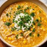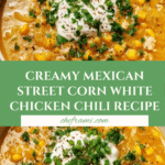Keywords: Mexican street corn chili, white chicken chili, creamy chicken chili, Mexican comfort food, shredded chicken chili, easy weeknight chili