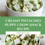 Keywords: Pistachio Puppy Chow, Puppy Chow Snack Mix, Sweet Snack, Pistachio Dessert, White Chocolate Puppy Chow, Holiday Snack Mix