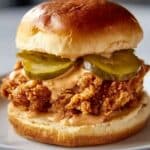 This Popeyes-Style Chicken Sandwich with Pickles delivers a crispy, juicy fried chicken fillet nestled in a buttery toasted brioche bun, topped with tangy pickles and a homemade spicy mayo. Marinated in buttermilk and spices, and coated in a seasoned flour and cornstarch blend, this sandwich perfectly mimics the iconic fast-food favorite with a crispy, craggy crust and bold flavors.