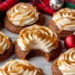 This image shows several round brown cookies arranged close together on a white marbled surface, each topped with a thick layer of white cream frosting piped in a rose shape. Over the frosting, there is a generous drizzle of golden caramel sauce that adds a shiny texture. One cookie in the center has a bite taken out, revealing a soft inner texture with the cream layer beneath. In the background, a colorful red and green cloth and two small holiday ornaments, one red and one silver, add a festive touch. photo taken with an iphone --ar 4:5 --v 7