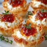 This Quick Pepper Jelly Cream Cheese Appetizer combines creamy, spicy, and crisp textures for an irresistible party bite. Mini phyllo shells are filled with smooth cream cheese and topped with sweet and tangy red pepper jelly, then baked briefly until warm and slightly crisp. Garnished with fresh thyme or green onion, these appetizers are perfectly suited for entertaining or simple snacking.