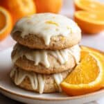 Three soft cookies stacked on top of each other on a white plate, each cookie light brown with small orange zest bits inside. The top cookie is drizzled with white icing that looks creamy and thick. On the right side of the plate, there are fresh round orange slices showing a juicy bright orange color. The background shows whole oranges and halves blurred on a white marbled surface. photo taken with an iphone --ar 4:5 --v 7