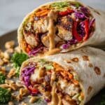 This flavorful chicken wrap combines juicy marinated chicken thighs with a vibrant Asian slaw and a creamy, tangy peanut sauce. It’s a perfect quick lunch or light dinner that offers bold flavors and satisfying textures all wrapped up in a soft tortilla.
