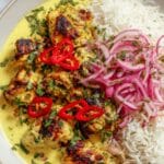 - Finishing Touches: Slice the rested chicken thighs and nestle them into bowls with the cooked white rice. Spoon the creamy Amarillo sauce over the chicken, then garnish with thinly sliced red onion, optional red chili slices, and chopped fresh cilantro.