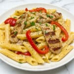 5. Combine Pasta & Protein: Add the cooked penne pasta into the sauce and gently toss to coat. Return the cooked chicken or shrimp to the skillet. If needed, stir in reserved pasta water gradually to loosen the sauce to desired consistency.