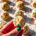 The image shows many small cookie dough balls with red, green, and white sprinkles inside them, placed on a white marbled surface covered with parchment paper. In the foreground, a woman's hand with green nail polish holds one cookie dough ball close to the camera, showing its soft, creamy texture and colorful sprinkles inside. The dough balls are round, light beige in color, and look soft and a little crumbly with bright festive sprinkles. Scattered sprinkles surround the dough balls, adding small pops of red, green, and white all over the scene. The light is bright, casting soft shadows behind the dough balls across the white marbled surface. photo taken with an iphone --ar 4:5 --v 7