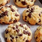 A close-up view of several freshly baked chocolate chip cookies on a baking tray lined with parchment paper. Each cookie has a rough, uneven surface with golden-brown edges and a fluffy, crumbly texture. The dough is pale yellow with dark brown and slightly melted chocolate chips scattered generously throughout each cookie's top and sides. The cookies look thick and soft in the middle, giving a home-baked, inviting feel. The background is a white marbled texture. photo taken with an iphone --ar 4:5 --v 7