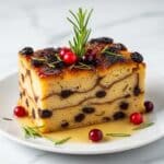 A close-up view of a thick slice of bread pudding placed on a white plate. The pudding has two visible layers: a golden-brown caramelized top with a crispy texture, and a soft, light beige bread layer infused with darker bits of raisins and herbs. The slice is oily and shiny, with a syrup puddle around its base. Small bright red cranberries and green herb leaves like rosemary are scattered on and around the pudding, with a fresh rosemary sprig standing upright on top. The plate rests on a white marbled surface. Photo taken with an iphone --ar 4:5 --v 7