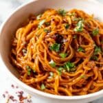 The image shows a bowl of noodles covered in a thick, reddish-orange sauce, twisted into several neat small piles inside a white bowl. The noodles look soft and coated evenly, with small bits of fresh green herbs sprinkled on top, adding a bright contrast. Tiny red chili flakes are scattered over the noodles and around the bowl, enhancing the spicy look. The bowl sits on a white marbled surface with a soft focus in the background, highlighting the food texture and colors. Photo taken with an iphone --ar 4:5 --v 7