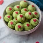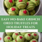 These no-bake Grinch Oreo truffles are a festive and fun treat perfect for the holiday season. Made with red velvet Oreos and cream cheese, they’re coated in bright green candy melts and topped with red heart sprinkles to capture the Grinch’s iconic look. Quick, easy, and irresistibly delicious!