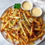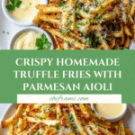 Delicious crispy homemade truffle fries tossed with fragrant white truffle oil and fresh grated Parmesan cheese, served with a creamy Parmesan aioli for an indulgent yet easy-to-make snack or side dish.