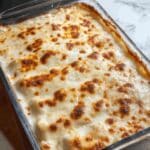A clear glass baking dish filled with a creamy baked dish that has a golden brown, bubbly top layer with some darker toasted spots. The surface layer is smooth and slightly uneven, indicating melted cheese or a creamy sauce that has browned in the oven. The edges show hints of a white sauce underneath the browned top, suggesting multiple layers beneath. The dish is placed on a white marbled surface, and the background includes some kitchen elements blurred out. photo taken with an iphone --ar 4:5 --v 7